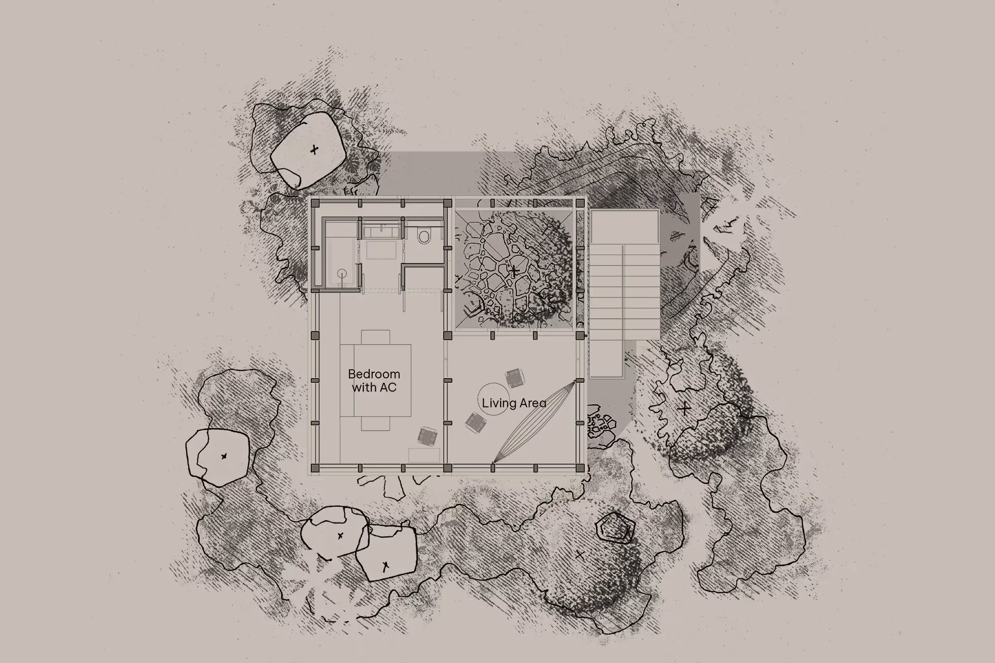 A true treehouse at 45m². Open to the jungle, stripped back to what matters.